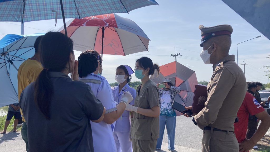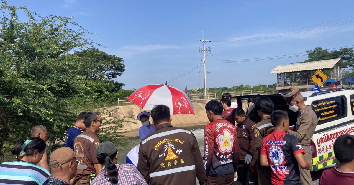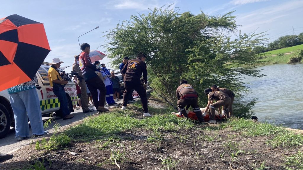 ร้อยเวรสอบสวนพร้อมกำลังเจ้าหน้าที่มูลนิธิสุขศาลานุเคราะห์นครปฐม แพทย์โรงพยาบาลกำแพงแสน ร่วมกันตรวจสอบศพจมน้ำเสียชีวิต บริเวณ ต.สระสี่มุม