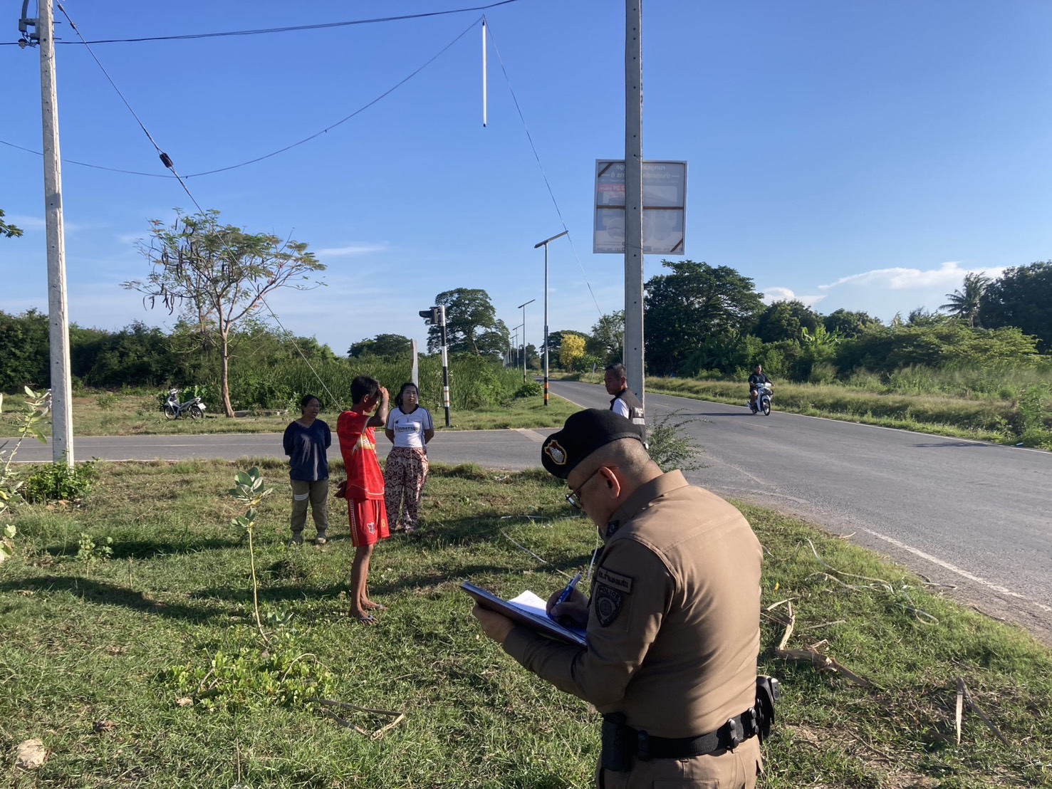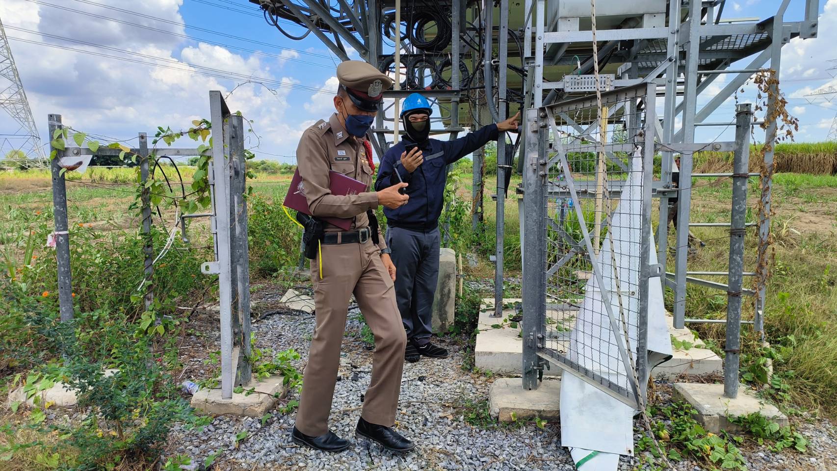 ร้อยเวรสอบสวนพร้อมเจ้าหน้าที่ตำรวจฝ่ายสืบสวนออกตรวจสถานที่เหตุเกิดสายไฟเสาสัญญาณโทรศัพท์