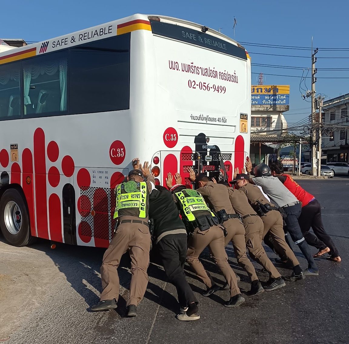เจ้าหน้าที่ตำรวจช่วยเหลือรถบัสรับจ้างไม่ประจำทางเสียกีดขวางการจราจร