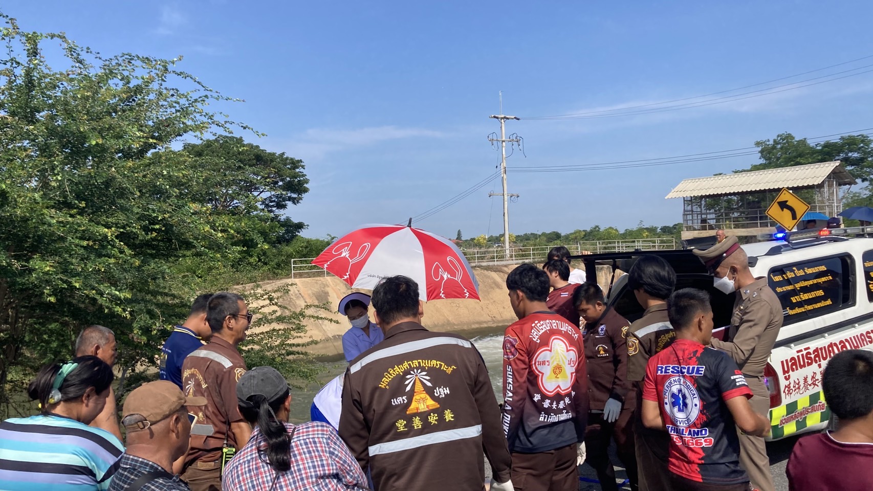 ร้อยเวรสอบสวนพร้อมกำลังเจ้าหน้าที่มูลนิธิสุขศาลานุเคราะห์นครปฐม แพทย์โรงพยาบาลกำแพงแสน ร่วมกันตรวจสอบศพจมน้ำเสียชีวิต บริเวณ ต.สระสี่มุม