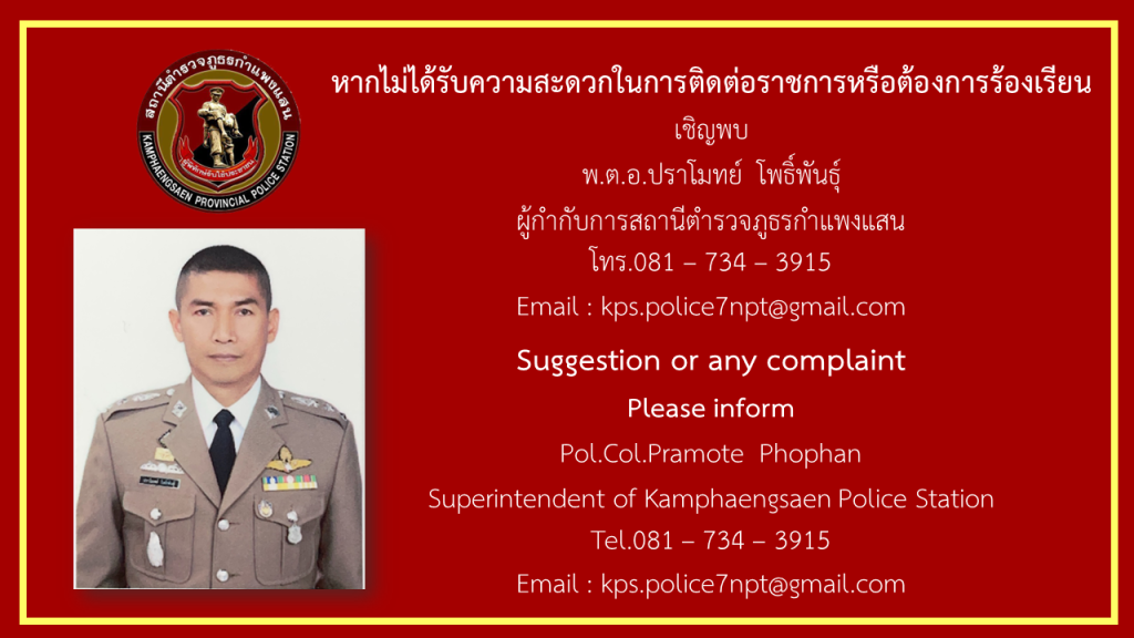 จดหมาย/ไปรษณีย์ : สถานีตำรวจภูธรกำแพงแสน เลขที่ 494 ม.1 ต.ทุ่งกระพังโหม อ.กำแพงแสน จว.นครปฐม 73140
